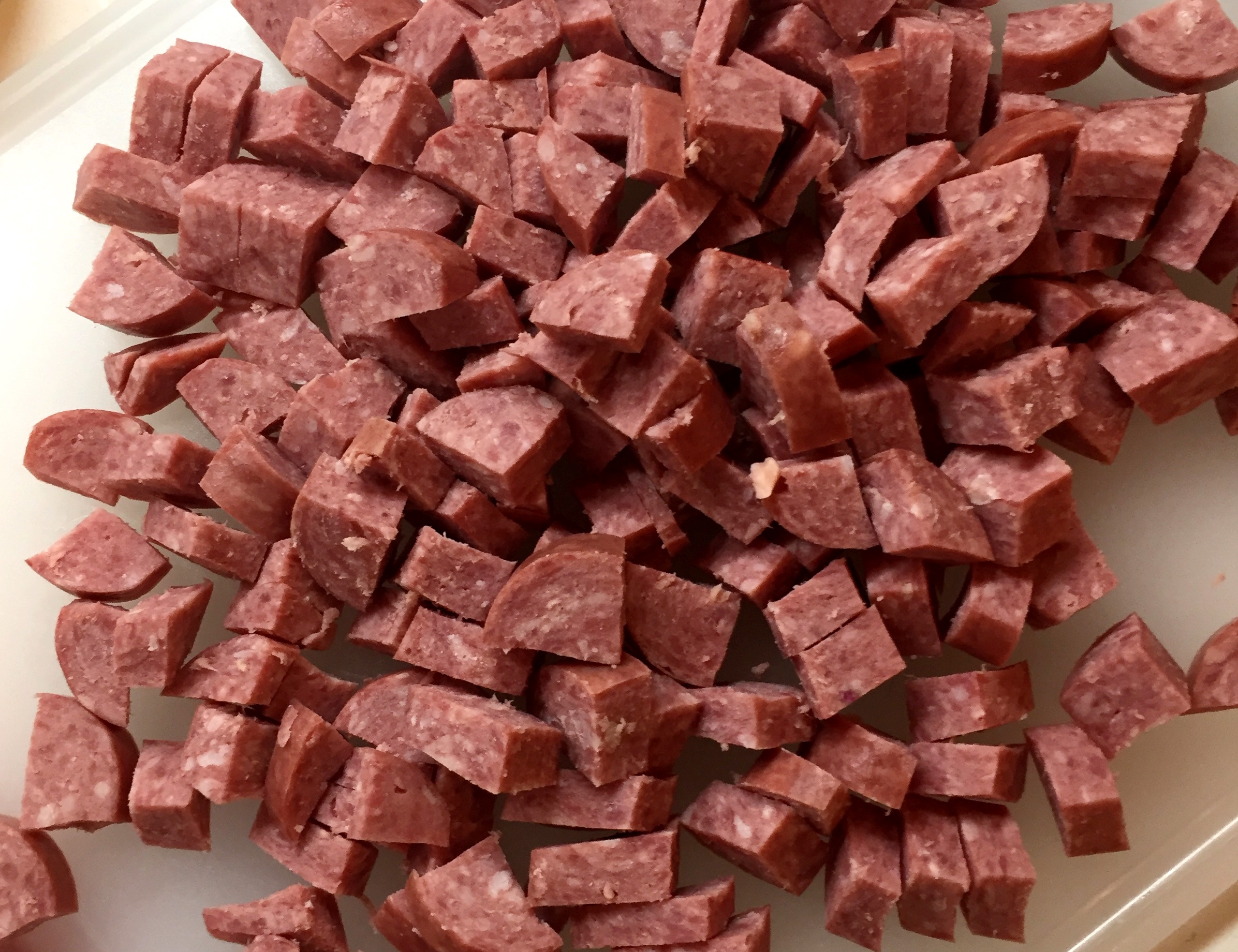 Green Beans with Kielbasa_Kielbasa Cubes_3.1.16 Published March 7, 2016 at 2392 × 1840 in Green Beans with Kielbasa, Pepper, and Poached Egg ← Previous Next →